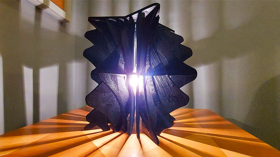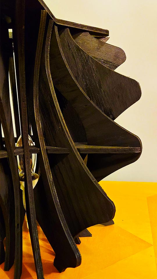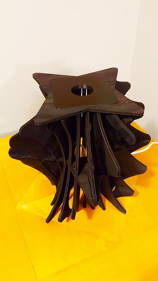 Lamp designed using CAD and laser cut from plywood, with 3d printed top.