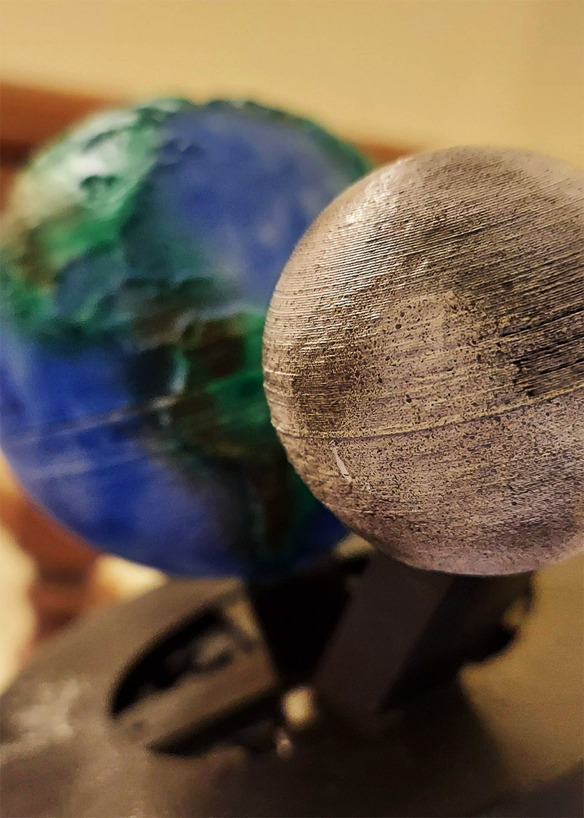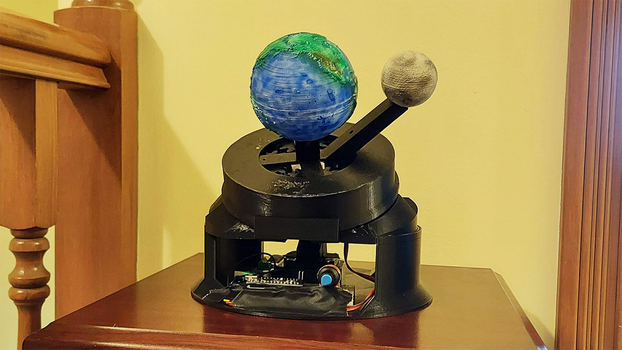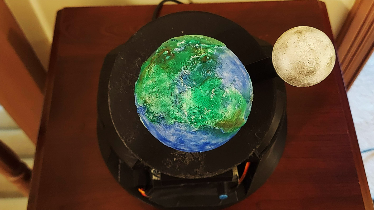 Earth and moon model with accurate rotation ratios. Servo-powered with a planetary gearbox, the moon completes and orbit about once every 28 days, reflecting reality. Sizes to scale, distance not to scale.